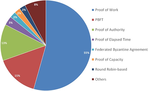 區塊鏈活動也可以根據使用的平臺和共識算法進行分類。60% 正在開發基于以太坊的解決方案作為起點,而 55% 使用過 PoW 算法。