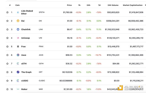 DeFi項目鎖定資產前十排名及鎖倉量 數據來源:defillama