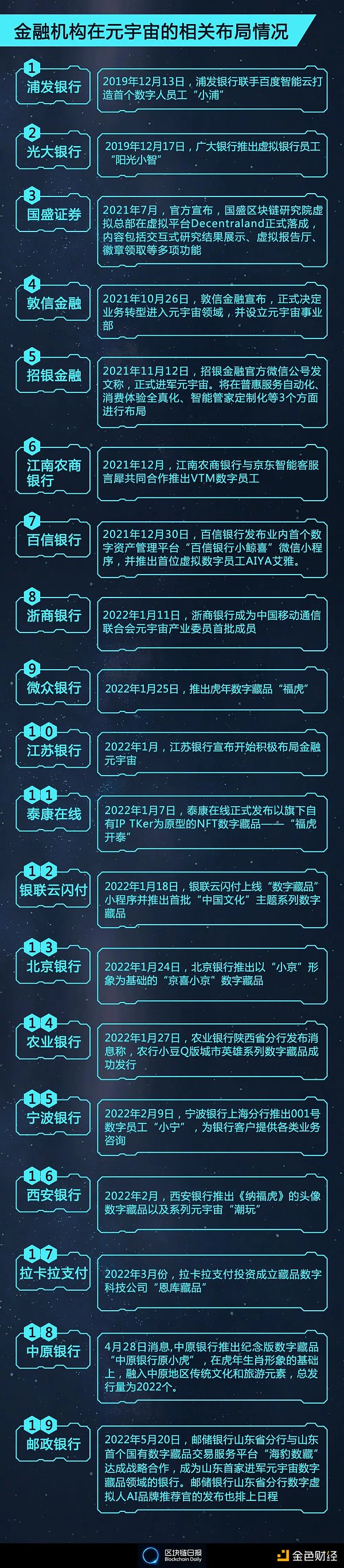據區塊鏈日報記者不完全統計,截至目前包括銀行、券商、保險在內的19家機構都試水了元宇宙。其中虛擬人、數字藏品成為目前金融機構進入元宇宙的最主要賽道。