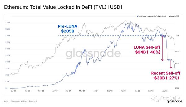 DeFi生態系統中更受歡迎的指標之一是總價值鎖定(TVL)的概念,它試圖跟蹤存入各種DeFi協議中的代幣的美元或ETH計價價值。這些協議包括貨幣市場、借貸協議、去中心化的交易所流動性池,等等。DeFi協議的一個流行用途是獲得杠桿,通常是通過以美元為基礎的穩定幣借入加密貨幣抵押品。在許多情況下,這種杠桿被交易和/或重新存入DeFi協議,形成一種鏈上再抵押的形式。隨著資本越來越多地采取避險定位,DeFi協議中的TVL已經看到了一個戲劇性的解套,這是由兩個主要機制造成的。