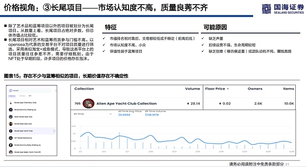 第三類是長尾項目。它們的數量最多價格最低,有一些市場上不是很受認可。它們的特點就是市場認知度不是特別的高,然后也會存在質量良莠不齊的現象,市值排名相對會比較靠后一些,或者是波動性比較大。我們認為它的保值性可能跟前面的這種已經建立起非常強的口碑和品牌力的這種項目,還是有一定差距的。這是NFT市場的一個比較重要的投資風險的來源。