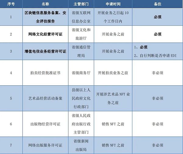 當前我們認為,以下幾項行政許可及資質,是在與在中國大陸境內開展NFT相關業務關聯性最強的,如“區塊鏈信息服務備案”等更為必不可少的資質,務必提起重視,具體詳情見下文。