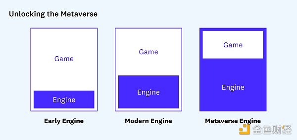 然而,在考慮元宇宙時,引擎扮演著更重要的角色。為了打破將一款游戲或體驗與另一款游戲或體驗隔開的墻,游戲可能會被封裝并托管在引擎中,而不是相反。在這個擴展的視圖中,引擎變成了平臺,這些引擎之間的通信將在很大程度上定義我所認為的共享元宇宙。