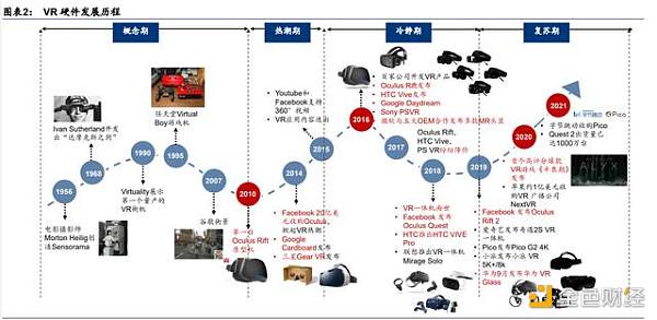 初期的 VR/AR 概念分別在上世紀 50-60 年代先后提出,之后 20 年內經歷了漫長的實驗室 開發和 B 端商用探索,波動上升中產品形態不斷向輕量化、小型化、深度沉浸迭代。2010 年以后,隨著互聯網和智能手機終端的逐步成熟和消費端持續滲透,ARVR 應用開始 C 端 落地的探索。進入 21 世紀的第二個十年,元宇宙被預言將成為互聯網的下一個形態,而 ARVR 也被寄希望成為元宇宙中全新的人機交互平臺。