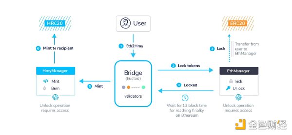 Harmony官方介紹指出,跨鏈橋是一種通過兩個流程驗證跨鏈交易來連接兩個區塊鏈的技術:1、轉移資產流程:資產鎖定在Ethereum同時等金額資產在Harmony上被鑄造。2、贖回資產流程:在Harmony上鑄造的資產被銷毀同時在以太坊上解鎖等值資產。