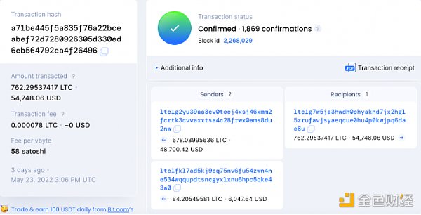 第一個發送者地址代表MWEB LTC從前一個擴展區塊移動到新的擴展區塊(接收地址ltc1g7w5j…),第二個發送者地址代表上面的掛鉤交易。
