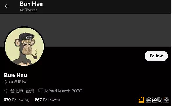 c)Bun Hsu 的 Twitter 頭像是無聊猿 BAYC #7066,這是 machibigbrother.eth(Jeff 的公開錢包)贈送給他的。