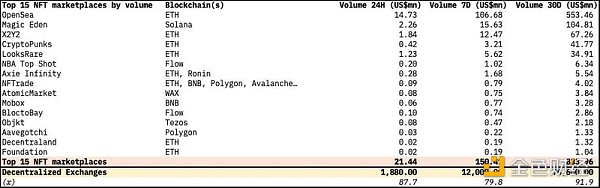盡管NFT在2021年和2022年初表現活躍,但與DeFi相比,NFT交易活動的水平只能說還好。前15家NFT市場占據了全球NFT市場的絕大多數份額,但其總交易量還不到去中心化加密貨幣交易所的2%,更不用說2021年交易量高達14萬億美元以上的中心化交易所了。
