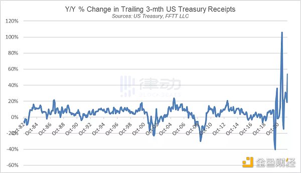 首先,為擺脫新冠疫情產生的嚴重影響,美聯儲與財政部施行了史無前例的財政刺激政策,這也間接甚至直接制造出了當前我們所看到的「稅收泡沫」。但隨著財政政策的收緊以及利率上調,稅收收入將快速、大幅的下降。