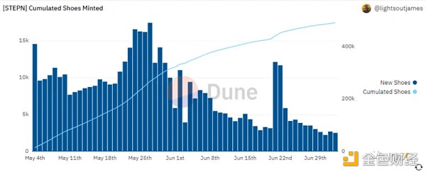有了高度顆粒化的原始數據,分析師便可以在Dune Analytics自由創建鏈上分析。如每日StepN新鞋鑄造及歷史積累數據 https://dune.com/queries/627689/1170627