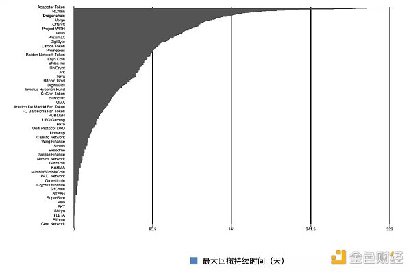 我們發現,柱狀圖中的高點集中在 20 天之內和 400 天左右,也就是說,幣種見頂的情況可以簡單粗暴地分成兩大類: