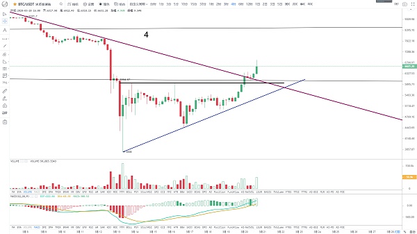 短期4小時走勢,可以發現,價格昨晚放量突破前期大跌形成的上升三角水平壓制5950美金,同時突破前期9187美元回落的中期下降趨勢線,而后價格迎來快速反彈,一直漲至目前最高6900美金上方,短線走勢相當強勢,4小時MACD多頭量柱逐步增強,快慢線0軸上方發散向上,其余短線指標也都保持向上姿態,均線上5日線勾頭上行,價格站上10日線,日線MACD指標線水下即將金叉,一旦強勢上穿金叉形成,量能配合,短線延續反彈的概率大,下一目標將有望向上試探7100-7200美金雙重壓力區,該位置是20日均線壓力位,同時也是這一波10500美元回落的斐波那契50%點位壓力,從中長線趨勢來看,近期的強勢上拉,依舊屬于反彈的范疇,能否形成大方向上的V形反轉還需觀察能否站穩7200美金上方,個人認為,在沒有反復筑底的情況下,很難形成反轉趨勢,不排除有沖高回落二次探底的風險,這個位置還是要謹慎。