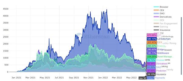 橋類別的回報率為 -28%,但它主要由TITAN(71%)支撐,而SYN(-74%)和REN(-80%)表現不佳。CEX(-39%)、AMM(-45%)和DEX(-50%)設法保持在-50%以上,而所有其他類別的范圍在-60%至-85%之間。