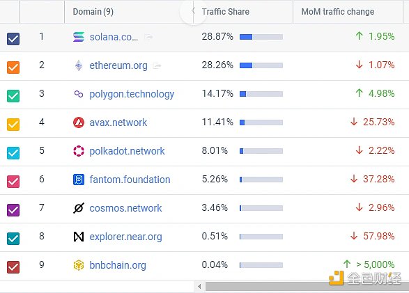 再從各自區塊鏈瀏覽器的訪問量看一下,我們認為這個指標比看官網流量更能代表真實/留存用戶,從近一年的總訪問量看 ETH 和 BSC 明顯占比更大,但是 BSC 呈持續下降趨勢;SOL 增量最快;Polygon / Avax / Ftm 在高峰回落后都留存了一定的量;Near 最低但也呈現出上漲趨勢。