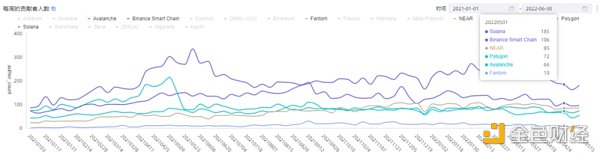 從體量來看,SOL 和 BSC 長期霸占前兩位,接下來是 Near / Polygon / Avax,而 Ftm 墊底。