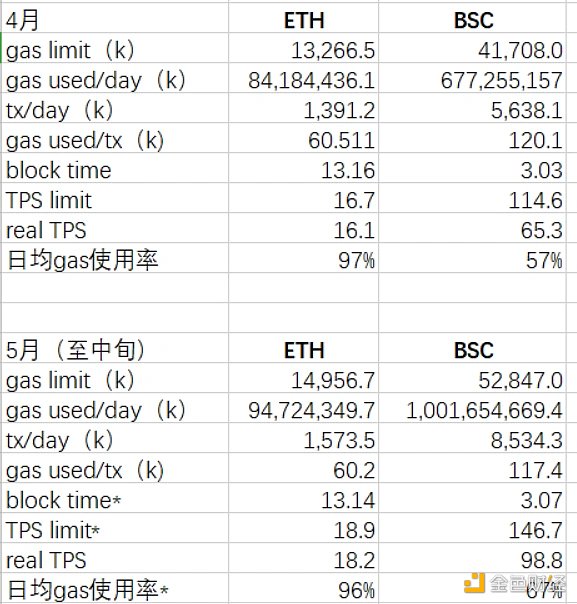 在瀏覽器上分別取得各鏈的相應數據(gas limit、gas used/day、tx/day、block time)并取平均數得到 ETH 和 BSC 的 TPS 上限分別為 18.9 和 146.7。