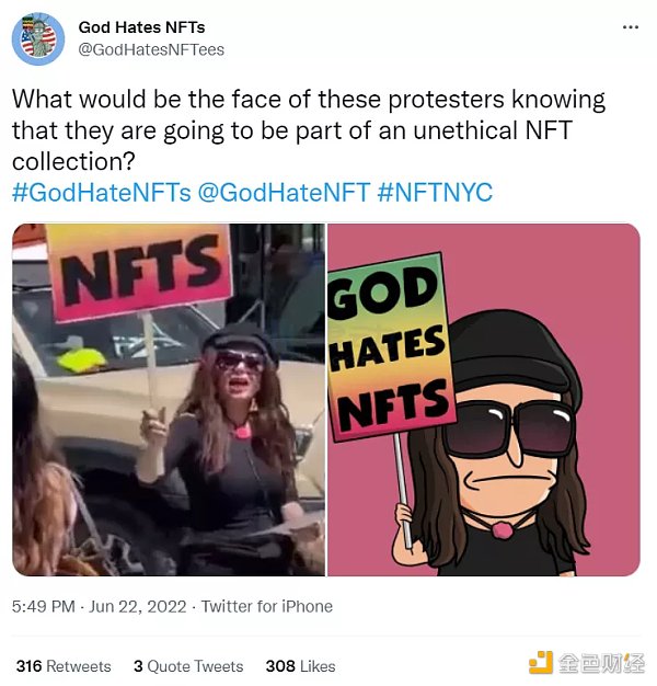 短短 2 天后,6 月 22 日一個名為 God Hates NFTs 的 NFT 項目就在 Twitter 上宣布將要將這些在抗議現場的人物形象制作成一個 NFT 系列,并聲稱「just for the culture(只是為了文化)」,而它的「炒作」之路才剛剛開始。