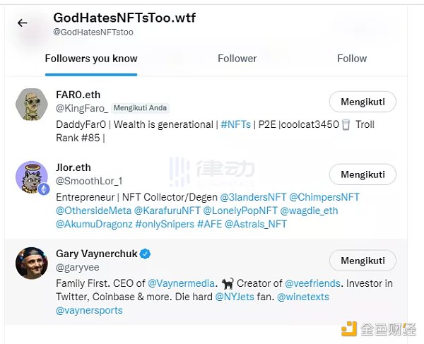 有人真的找到了「證據」,發現 Gary Vee 關注了另一個名為 GodHatesNFTsToo.wtf 的 NFT 項目。它們都是「God Hates NFTs」,「背后的大人物是 Gary Vee」的這個「謠言」一時間甚囂塵上,但直到今天也沒有任何實際的證據證明它們直接真的有聯系。