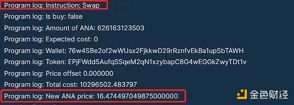 第二步,攻擊者開始進入「黑化狀態」,兩次調用 swap 指令將獲得的 ANA 兌換為 USD,價格隨后分別跌至 22.73,16.47。