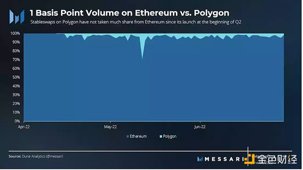 如此前所述,1 bps(0.01%)費用等級的引入使得 Uniswap 的穩定幣兌換池具有競爭力。不過,二季度 USDC/USDT 交易量下降了 17.4%。值得注意的是,由于 UST 脫鉤引發的市場恐慌蔓延至 USDT,在此期間的高成交量可能來自那些尋求兌換為 USDC 的用戶。