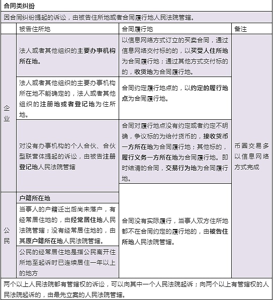 (1)幣圈合同或者其他財產權益糾紛的當事人可以在不違反我國民事訴訟法對級別管轄和專屬管轄的規定基礎上,書面協議選擇被告住所地、合同履行地、合同簽訂地、原告住所地、標的物所在地等與爭議有實際聯系的地點的人民法院管轄。