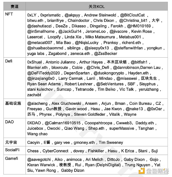 根據調研人群對各賽道關注 KOL 的列示,因為名單分散,不做集中度或詞頻分析,在此做分類整理列示,以供參考之用(可搜索使用)。