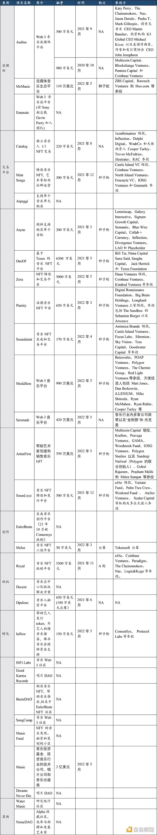 以下我們整理了主要 Web 3 音樂板塊的項目融資情況,大多數項目集中在種子輪融資。