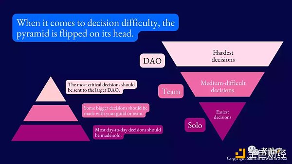 一旦決策必須在 DAO 級別做出,就會格外困難,因為這需要更長的時間才能達成共識。所以只應該保留最重大的決定。就像這個倒金字塔: