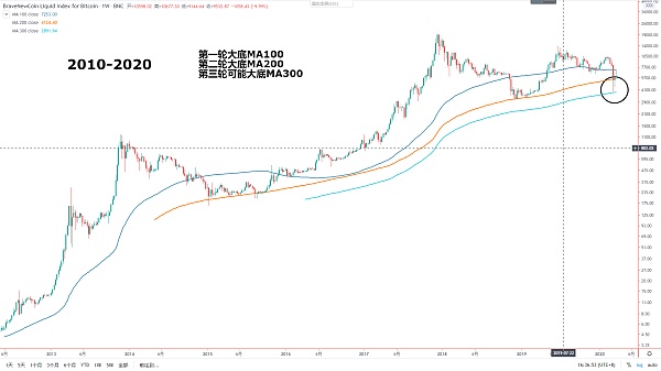 后面價格再次觸頂回落,并跌至周線MA100附近止跌企穩,形成日線級別底背離形態,隨后開啟了年初這一波減產幣小陽春行情,一直漲至10500美金頂點,后面開啟了前期緩跌,后期在疫情影響下的加速下跌走勢,并一直跌至3800美金低點在回升至目前6000美金上方,我們發現最低點已經接近周線MA300支撐,目前價格又收回至周線MA200上方,并且這兩周反彈都出現上下插針結構,上插針頂點接近周線MA100附近,而這種十字星明顯是為了多空雙爆殺合約,不過目前走勢仍屬于大跌后的震蕩盤整,周線級別依舊偏空,在沒有反復筑底直接V形反轉的概率不大,不排除后續二次探底的可能,如果價格再次回落測試周線MA300支撐,很可能將是下一輪牛市啟動的絕佳底部位置,穩健者可以等底部結構形成,右側信號明確后在入場也不遲。