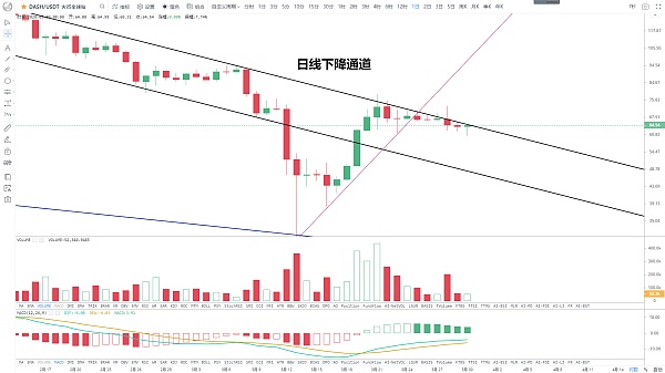 前期構筑階段頭肩底形態失敗后,跟隨大盤回落,并跌破前期大跌見底反彈得上行趨勢線,目前又步入一個4小時級別得下降通道,和其余主流幣一樣,短線想要走強,必須放量強勢突破壓制線,不過按目前量能,直接突破得難度較大,若不能放量,價格沖高遇阻回落得可能性大,這個位置還是要謹慎,放大級別來看,只要不跌破198美金低點,整體仍處于震蕩箱體區間內,壓力222美金。