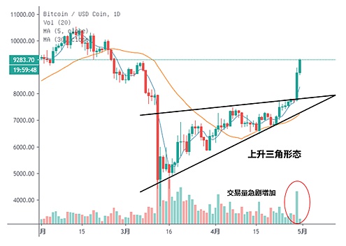 從技術分析角度看, 自3月中旬起,比特幣市場開始逐步復蘇,大約在4月上旬出現上升三角形態的雛形。上升三角形態屬于看漲形態,在4月29日,比特幣價格突破三角形態的上邊界,并且在突破時交易量急劇增加,上升三角形態正式完結,隨后比特幣價格出現暴漲。