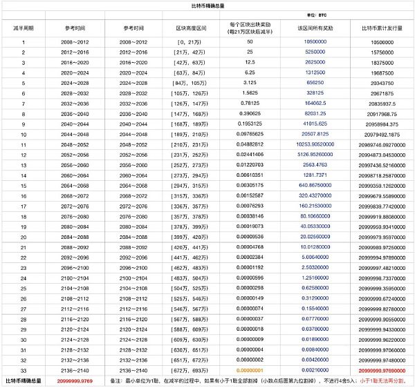 按照減半規則,到 2140 年 2100 萬(精確數據為 20999999.9769)比特幣全部挖出。減半規則和比特幣最小可分單位,決定了比特幣總量。