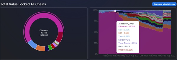 公鏈作為區塊鏈領域最重要的基礎設施一直都是市場的焦點。以太坊作為龍頭公鏈一直不斷面臨著許多號稱“以太坊殺手”的新興高性能公鏈的挑戰,以太坊的TVL市場份額正在被不斷蠶食,從2021年最高的將近97%的市場份額到目前降低到59.05%的市場份額,公鏈之間的競爭已經進入了白熱化。POW工作量證明機制下的以太坊已經逐漸無法適應時代的需求,以太坊能做的只有進行升級擴容才能維持住以太坊在多公鏈時代下的霸主地位。