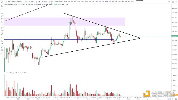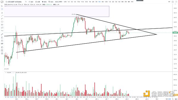 雖然又突破了前期4小時下降通道,不過量能一般,反彈相對其余主流幣弱勢一些,上方短期主要壓制周線趨勢線和20日均線42.5美金,這個位置放量站上,后續空間才會打開,近期整體聯動為主,大盤強勢,那么上去的可能性就較大,目前大概率為蓄勢階段,支撐40.