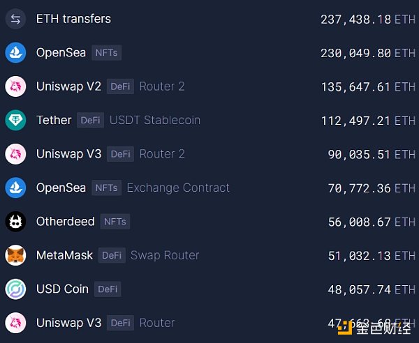 值得一提的是,由于去年下半年和今年上半年 NFT 市場的持續火爆,OpenSea 合約的以太坊銷毀量長期霸占「榜一」的位置。但就在近期,隨著 NFT 市場的持續降溫,以太坊轉賬的銷毀量超越 OpenSea 位居第一。