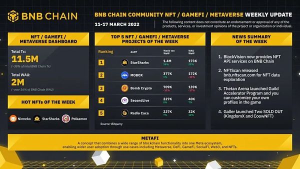 最近很多數據都表明,BNBChain上的GameFi正在爆發的前夜,BNBChain上Dapp 60%的DAU都來自于GameFi,BNBChain上前10名游戲的市值就達到了近10億美元,BNBChain的WAU(周活躍用戶數量)數據增長最快就是StarSharks。