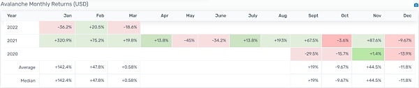 目前 Avalanche 在加密市場總市值排名第 10 位,公鏈分類中市值排名前 5%,僅次于 Ethereum、Cardano、Solana、Terra。2021 年 Q4 至 2022 年 Q1,Avalanche 的投資回報率出現了復蘇趨勢。這種復蘇主要基于該生態較為穩定的鏈上數據增長與生態合作。