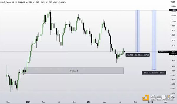從技術角度看 $RUNE 代幣,我們從 ATH 大約下降了 88%。如果我們在這個熊市中再次下跌,我關注位于 1 美元附近的需求區。