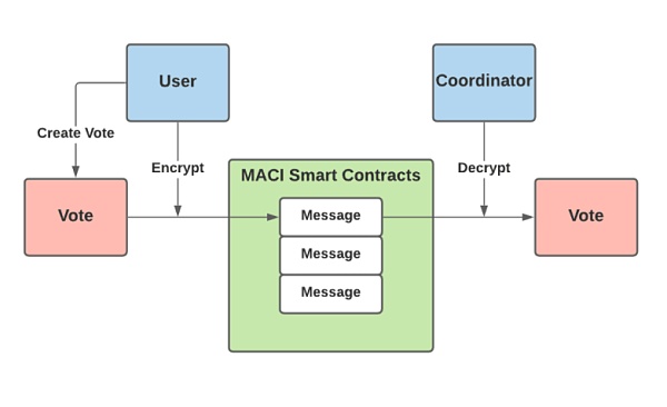 在MACI工作流程中,有兩種不同的角色:用戶(投票者)和一個受信任的協調者。用戶通過MACI智能合約在區塊鏈上投票,協調者統計票數并發布最終結果。