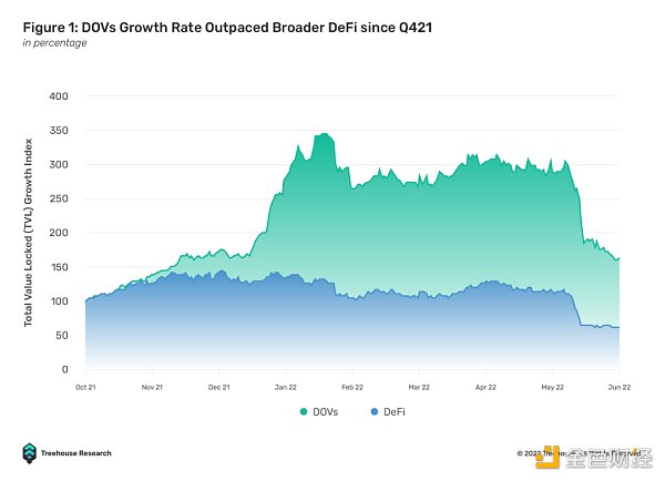 2021 年第 4 季度以來的 DOV 與 DeFi 市場的增長率