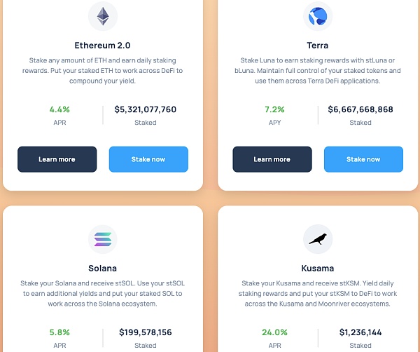 此外,Lido Finance也一直在試圖將質押服務拓展到更多鏈上。當前,其已在Terra、Solana、Kusama等區塊鏈上開發了專門的協議,支持用戶質押不同鏈上的原生資產以獲得獎勵。