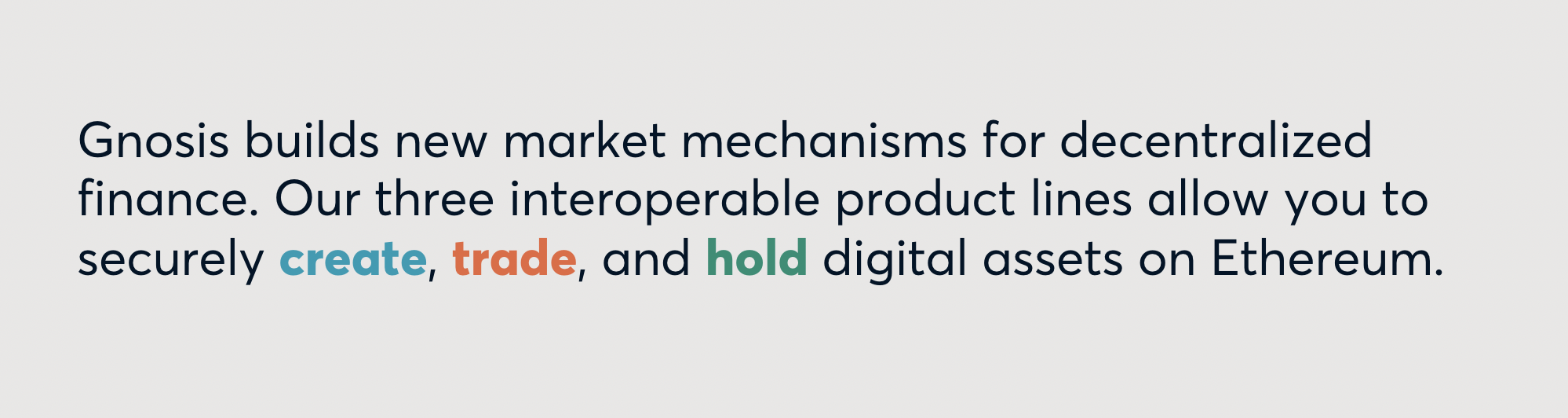 「Gnosis 旨在為去中心化金融建立了新的市場機制。我們的三個可互操作的產品線允許你在以太坊上安全地創建、交易和持有數字資產。」