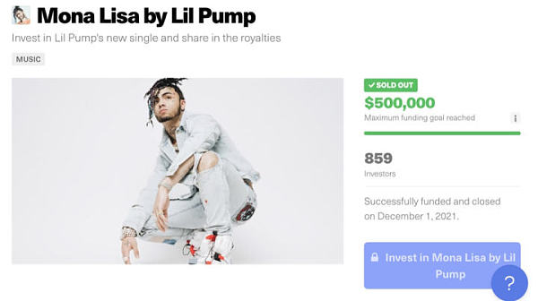 項目方合作的第一個NFT藝術家Lil Pump,是知名00后Rapper,在Spotify有720萬每月聽眾數。這次出售也很成功,2小時內就融到了上限50萬美元。