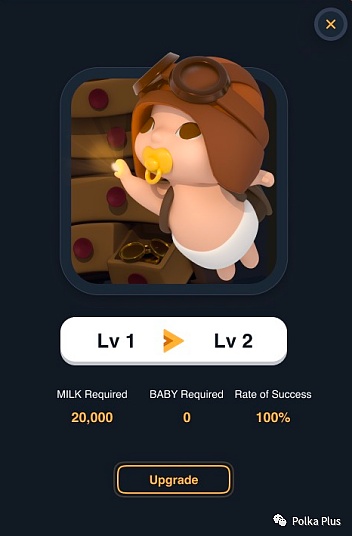 最開始召喚出來的寶寶角色都是1級,需要消耗一定量的MILK來升級寶寶。您的寶寶等級越高,您接下來升級所需的MILK就越多。您可以通過每日挖礦、PVE 等方式賺取 MILK。