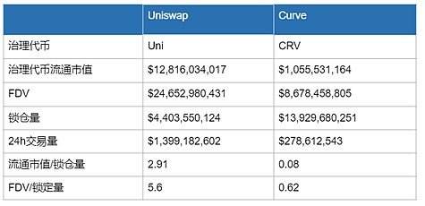 值得注意的是,超過40%質押在協議中的CRV未算在代幣流通量中,也導致Curve流通市值較低的原因。但即使算上這40%代幣,CRV的流通市值以及FDV都遠遠落后于Uni。運營數據方面,Curve擁有更高的鎖倉量,而Uniswap擁有更高的交易量。通過流通市值或者FDV與鎖倉量的比值來看,與Uniswap相比,Curve的流通市值與FDV相對被低估。