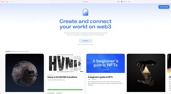Mirror.xyz當前是一個主要用來發布文章的平臺,結合 DAO、Web3、NFT 。