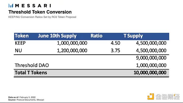 作為 RC0 的一部分,KEEP 和 NU 代幣的兌換率分別設定為 1:4.78 和 1:3.26。費率基于兩個協議停止通貨膨脹后每個代幣的總供應量,并導致每個協議代表Threshold網絡的 45%。T 的初始供應設置為 100 億,其中 10% 保留給 Threshold DAO。現在,隨著轉換率和代幣名稱的最終確定,真正的工作可以開始了——確定 DAO 治理。