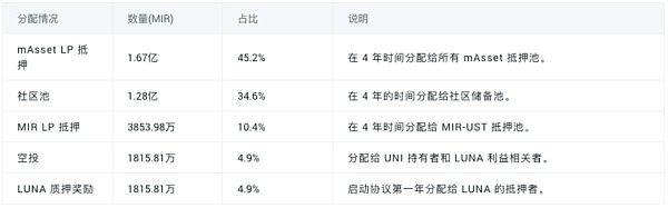 空投的分布情況如下:UNI空投——16.66%(向UNI持有人空投16.66%的代幣,約為915萬,以創造流動性);LUNA staker空投——16.66%(向Terraswap LUNA staker空投16.66%的代幣,約為915萬);社區池——66.66%(分配給社區池的66.66%的代幣,約為3660萬,用于資助協議的治理和初始開發)。沒有投資者或開發者收到最初的MIR供應。Mirror計劃直接向社區參與者分發MIR代幣,以啟動具有去中心化控制的協議。