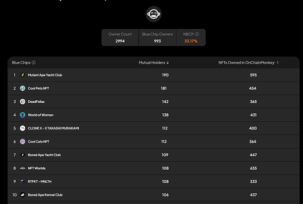 在Coniun網站上的藍籌指數,也有33.17%,意思是在OCM的持有人里,三分之一的人持有藍籌項目,根據其它藍籌的持有數量,排名前10的有有無聊猿、clone-x、NFTworld……還是非常強勁。