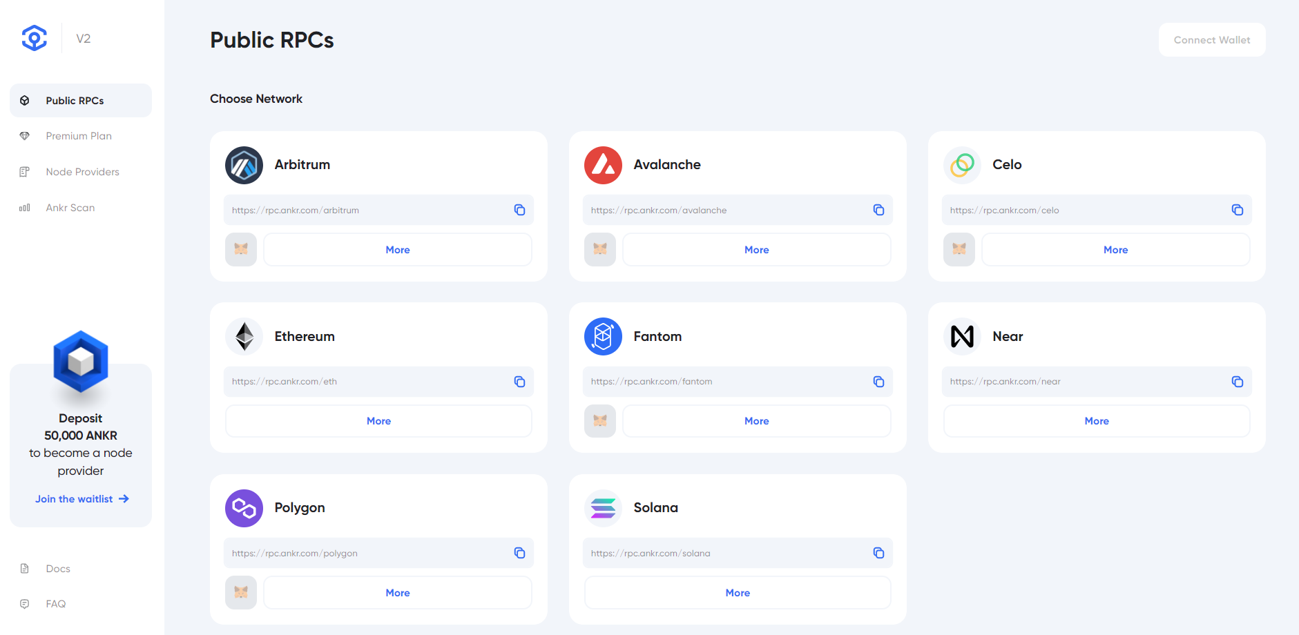 Protocol - 協議是區塊鏈技術的重要組成部分,使信息能夠在加密網絡中安全可靠地交互。Ankr Protocol 服務內容包括 RPC(遠程過程調用)、AnkrScan(區塊鏈實時瀏覽與分析)、質押解決方案和開發者工具。目前,Ankr Protocol RPC 服務涵蓋 Arbitrum、Avalanche、Celo、Ethereum、Fantom、Near、Polygon、Solana 共 8 大公鏈,也就是說,當開發者需要構建相應公鏈的 dApp 時可以選擇 Ankr 一鍵鏈接到公鏈。